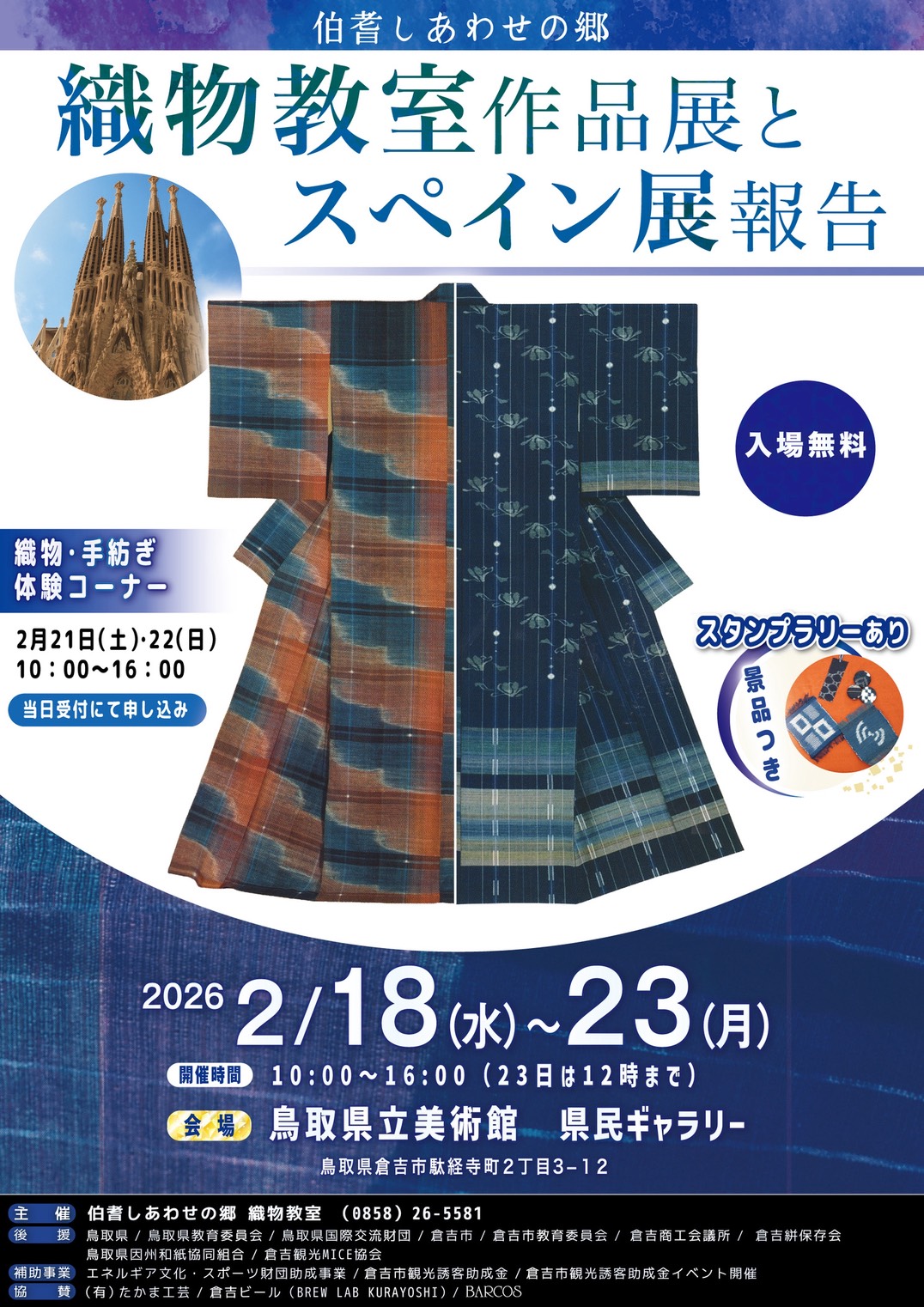 入場無料となっています。また、展示会場ともう1か所倉吉市内スタンプポイントでスタンプを集めると素敵な絣グッズをプレゼントするスタンプラリーを開催していますので、ぜひご来場ください。